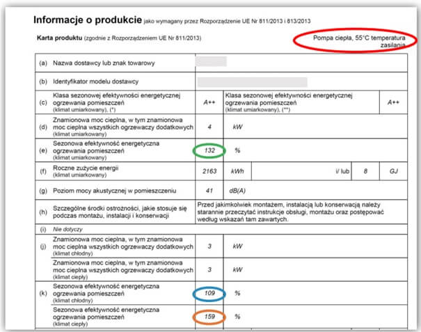 O tym ile szacunkowo będzie kosztować wykorzystanie pompy ciepła do ogrzewania mówi nam wskaźnik SCOP. Producenci nie chętnie podają go wprost, natomiast można go oszacować znając wartość sezonowej efektywności energetycznej ogrzewania pomieszczeń dla naszego klimatu. Informację tę znajdziemy w karcie produktu.