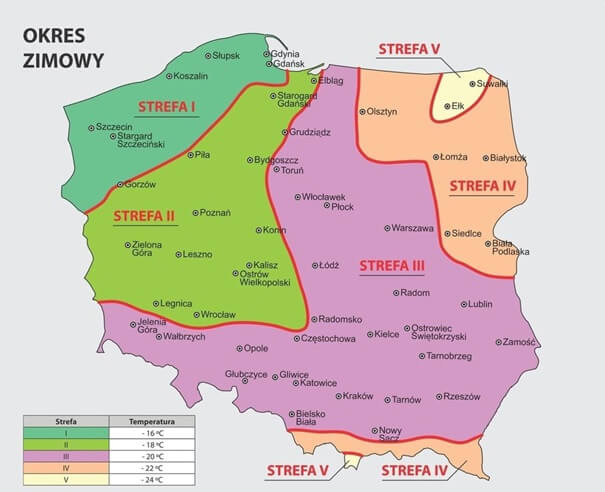 Polska jest podzielona na pięć stref klimatycznych, w każdej z nich obliczenia wykonywane są dla różnych temperatur minimalnych.